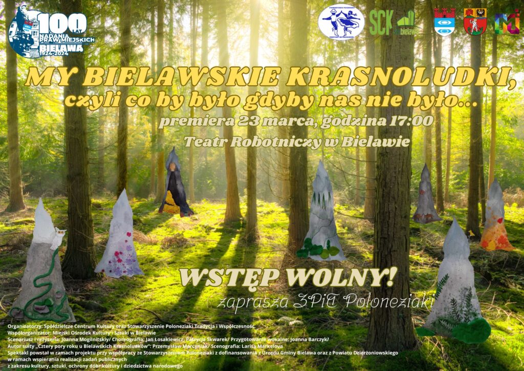 Serdecznie zapraszamy na premierę spektaklu „ My Bielawskie Krasnoludki, czyli co by było gdyby nas nie było…”, która odbędzie się 23 marca o godzinie 17:00 w Teatrze Robotniczym w Bielawie. Spektakl oparty jest na historii Bielawy od XIII w do XX wieku kiedy to Bielawa otrzymała prawa miejskie. Fakty historyczne zostały luźno i z fantazją połączone z przebywaniem na tych terenach legendarnych krasnali. Przedstawienie odpowiada na m.in. takie pytania jak: ile było krasnali, jakie mieli imiona, jak pomagali mieszkańcom, czy mieli magiczne moce, dlaczego tak naprawdę odeszli i kto ich zastąpił. Finał wieńczy suita „Cztery pory roku u Bielawskich Krasnoludków”. Spektakl powstał w ramach projektu przy współpracy ze Stowarzyszeniem Poloneziaki z dofinansowania z Urzędu Gminy Bielawa oraz z Powiatu Dzierżoniowskiego w ramach wspierania realizacji zadań publicznych z zakresu kultury, sztuki, ochrony dóbr kultury i dziedzictwa narodowego.