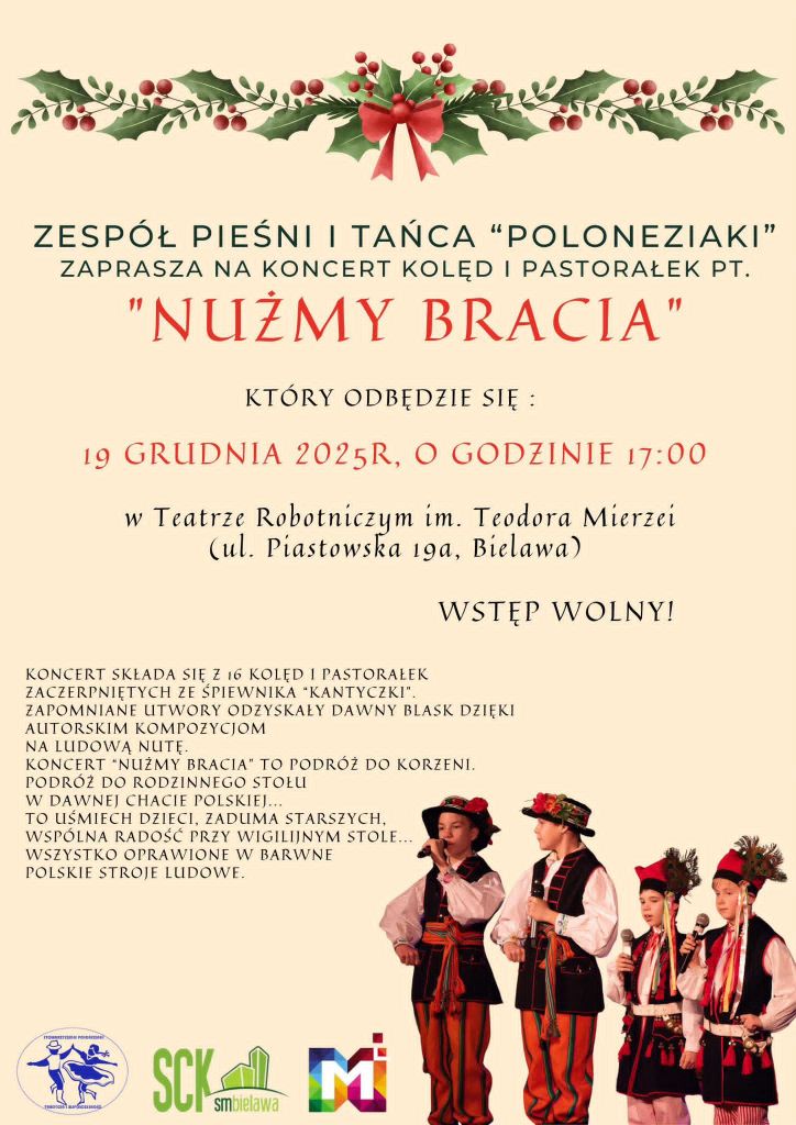 Zapraszamy wszystkich na nasz koncert kolęd i pastorałek pt. „Nużmy bracia”, który odbędzie się o godzinie 17:00 w piątek 19 grudnia 2025r. w Teatrze Robotniczym im. Teodora Mierzei w Bielawie.